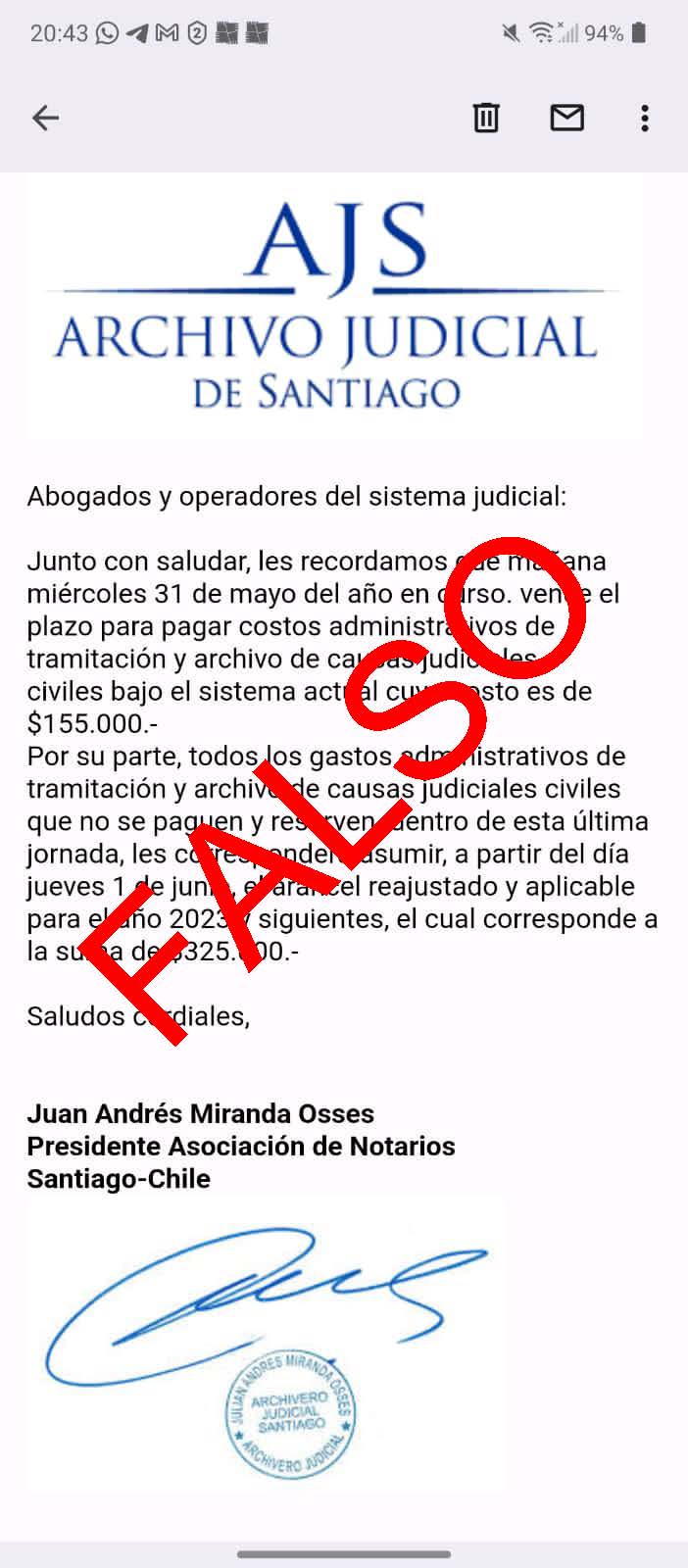 Advertimos a los usuarios sobre la circulaci贸n de un correo electr贸nico falso, donde se intenta suplantar mensajer铆a de don Juli谩n Andr茅s Miranda Osses, aduciendo una supuesta deuda por concepto de "costos administrativos de tramitaci贸n y archivo de causas judiciales civiles", solicitando un pago para regularizar esta situaci贸n.