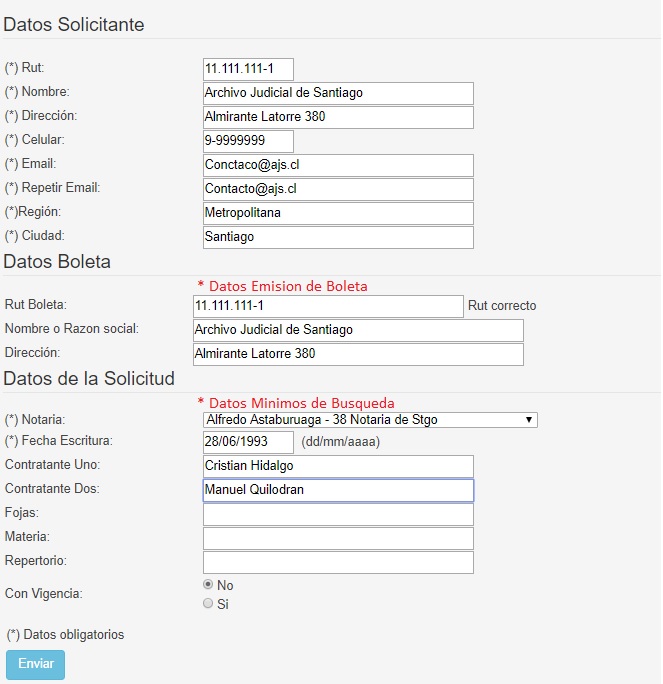 Para solicitar una copia de escritura pública o instrumento protocolizado el Usuario deberá ingresar en el formulario web de nuestro sitio (www.ajs.cl) al menos los siguientes datos: a) notaría en que se otorgó la escritura pública o instrumento protocolizado; b) fecha en que se otorgó la escritura pública o instrumento protocolizado; c) materia de la escritura pública o instrumento protocolizado; y d) nombre de los contratantes. El repertorio y la foja son datos que sirven para facilitar la búsqueda, pero en ningún caso son obligatorios.
